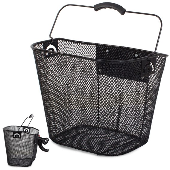 Koszyk jest dość pojemny, zmieści torbę i plecak, a także małe zakupy. Dodatkowo posiada wygodną rączkę do przenoszenia. Pasuje do większości rowerów ze średnicą kierownicy do 2,5cm.