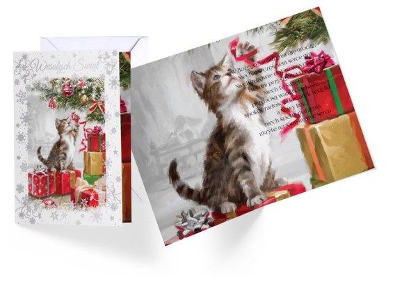 Kartka wielkości B6, zdobiona w zależności od wzoru metaliczną folią lub brokatem. Każda kartka posiada kolorowe życzenia w środku i koperte.