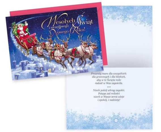Kartka wielkości B6, zdobiona w zależności od wzoru metaliczną folią lub brokatem. Każda kartka posiada kolorowe życzenia w środku i dopasowaną kopertę w komplecie. Wymiary karnetu po złożeniu: 11,7 x 16,6 cm.