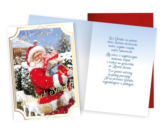 Kartka wielkości B6, zdobiona w zależności od wzoru metaliczną folią lub brokatem. Każda kartka posiada kolorowe życzenia w środku i dopasowaną kopertę w komplecie.