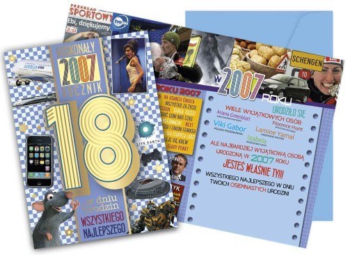 Karnet Vision "Urodziny 18" V-115 Kartka z serii To Był Rok, w której w środku i na froncie znajdują się ciekawe wydarzenia z danego roku. Wykonane z niezwykłą dbałością o szczegóły, zdobione folią holograficzną i w całości pokryte folią matową dla podkreślenia efektu prostoty i elegancji. Każdy karnet zawiera w środku starannie dobrane życzenia oraz dopasowaną kopertę. W powiększonym formacie 140x190 mm. Cechy szczegółowe: wnętrze: kolorowe, wyjątkowe życzenia w środku, w komplecie: dopasowana kolorystycznie koperta. wymiary kartki 14 x 19 cm okazja: 18 urodziny.