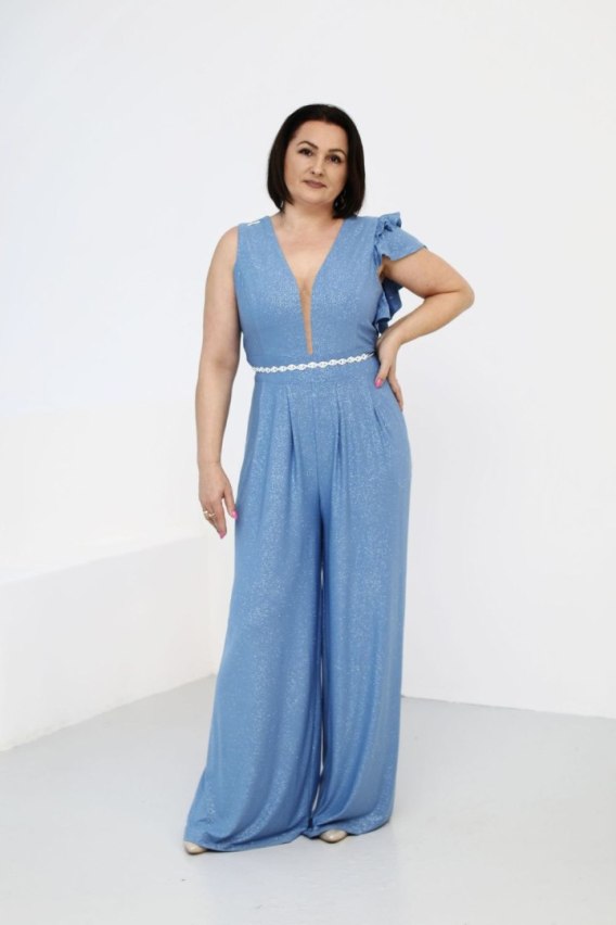 Elegancki kombinezon damski o wyjątkowym kroju, który łączy klasykę z subtelnymi, nowoczesnymi akcentami. Góra kombinezonu jest dopasowana, podkreślając sylwetkę, a dekoracyjne falbany na jednym ramieniu dodają mu wyjątkowego charakteru i kobiecości. Długie, zwiewne nogawki zapewniają komfort i elegancję, tworząc lekką, płynącą linię. Odcinany w pasie, doskonale akcentuje talię, nadając całości subtelnej proporcji. Zamek z tyłu umożliwia wygodne zakładanie, a podszewkowana góra gwarantuje dodatkowy komfort noszenia. Kombinezon wyróżnia się wysoką jakością wykonania, co czyni go idealnym wyborem na specjalne okazje, łącząc elegancję i styl w jednym wyjątkowym modelu. Do kombinezonu jest dodany pasek z cyrkonii, nie należy od zestawu.
