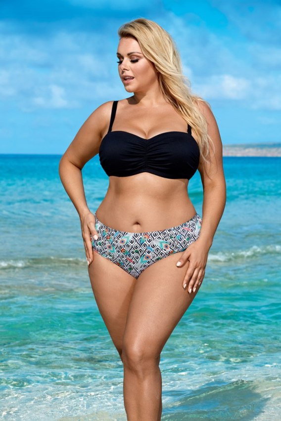 Dwuczęściowy kostium kąpielowy w ciekawych kolorach. Biustonosz usztywniany z fiszbinami, zapinany na plecach, ramiączka odpinane regulowane. Majteczki o komfortowym kroju na podszewce, z tkaniny w ciekawy wzór.