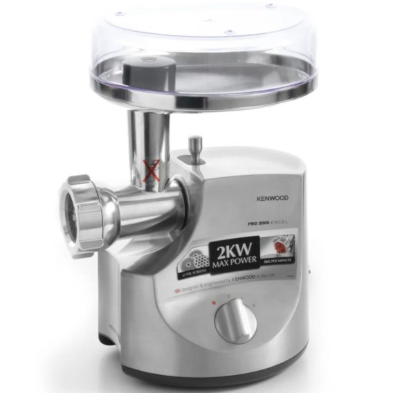 Maszynka do mięsa marki KENWOOD przeznaczona została do małej gastronomi. Jej chwilowa wydajność wynosi 180 kg/h. Obudowa wykonana została z satynowanego aluminium, kołek dociskowy z twardego tworzywa. Liczba obrotów silnika: poz.1- 150 obr./min, poz. 2 - 210 obr./min, rewers - 100 obr./min. W zestawie znajdują się 3 sitka o śr. 69 mm (z otworami śr. 3 mm, śr. 4,5 mm, śr. 8 mm), 2 końcówki do wyrobu kiełbas: śr. 12 i 21 mm oraz końcówka do wyrobu kebbe. Urządzenie nie jest przeznaczone do pracy ciągłej.