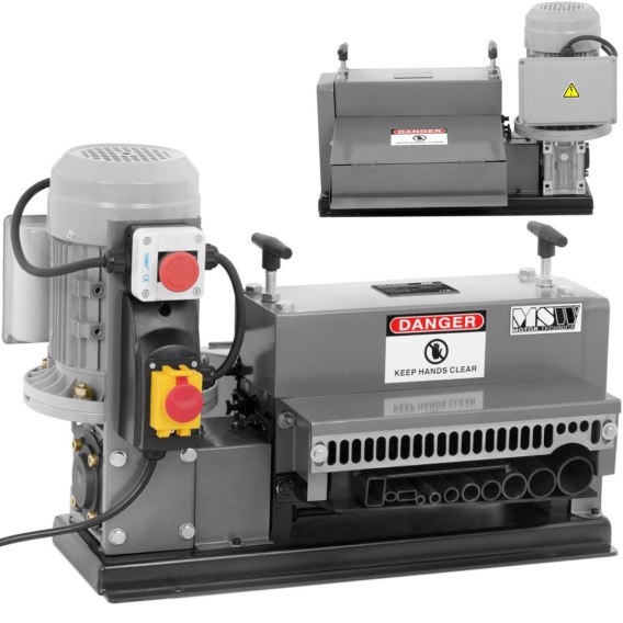 Korowarka do kabli marki MSW pozwala w krótkim czasie ściągnąć izolację z miedzianych i aluminiowych przewodów. Duża moc 750 W zapewnia prędkość cięcia do 16 m/min. Nacisk i ustawienie ostrzy są regulowane w celu dostosowania urządzenia do grubości izolacji. Odizolowywacz wyposażono w 11 otworów na kable o rozmiarach 38 mm, 28 mm, 23,5 mm, 17, 5 mm, 15 mm, 11 mm, 10,5 mm, 7 mm, 18 x 8 mm, 12 x 6 mm, 26 x 16,5 mm. Bezpieczeństwo pracy zapewnia wyłącznik awaryjny, który odcina zasilanie. Przełącznik ON/OFF posiada ochronę przed kurzem i brudem. Urządzenie można dla większej stabilności przykręcić do stanowiska pracy.