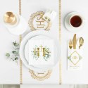 Serwetki komunijne z charakterystycznym dla serii Eukaliptus wzorem. Złoty symbol IHS z krzyżykiem nad literą H, otoczony jest zielonymi gałązkami eukaliptusa.