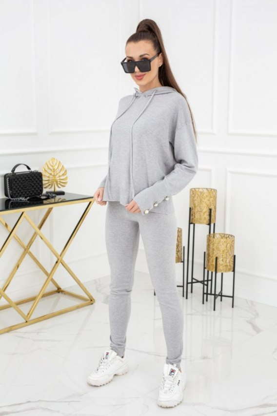 Co jeśli nie dres? śmiało wybierz miękki, dwuczęściowy zestaw z leginsami, najlepiej w świetnym, modnym kolorze. Kim Peral Buttons to ciekawa propozycja, w której komfortowo zrelaksujesz się na fotelu. Co Cię tu przywita? z pewnością wygodna, przyjemna w dotyku, elastyczna dzianina, zgrabny, niesamowicie kobiecy styl i urocze, ozdobne guziki na rękawach. Bluzka z kapturem, rękawy i nogawki wykończone miękkimi ściągaczami.