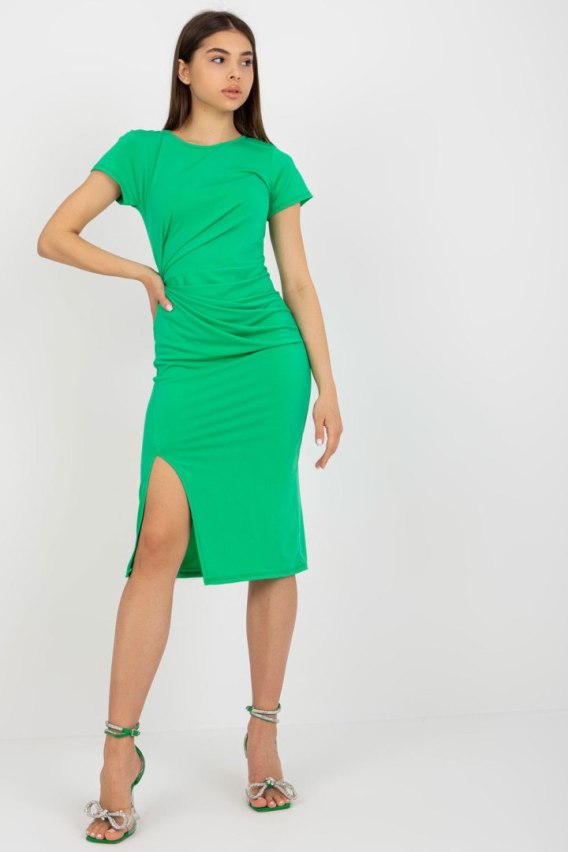 Sukienka o dopasowanym kroju z krótkim rękawkiem oraz okrągłym dekoltem. Na wysokości talii ozdobne marszczenie, u dołu rozcięcie.