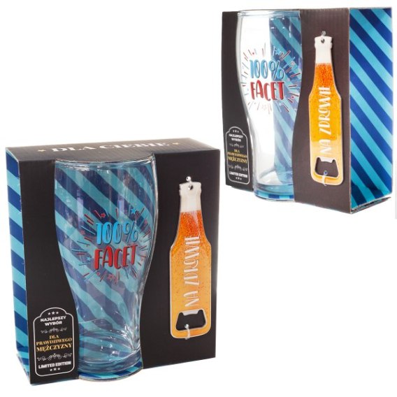Zestaw 2w1 szklanka do piwa z napisem' 100 % Facet" z otwieraczem do butelek "Na zdrowie " w ozdobnym opakowaniu prezentowym . 5