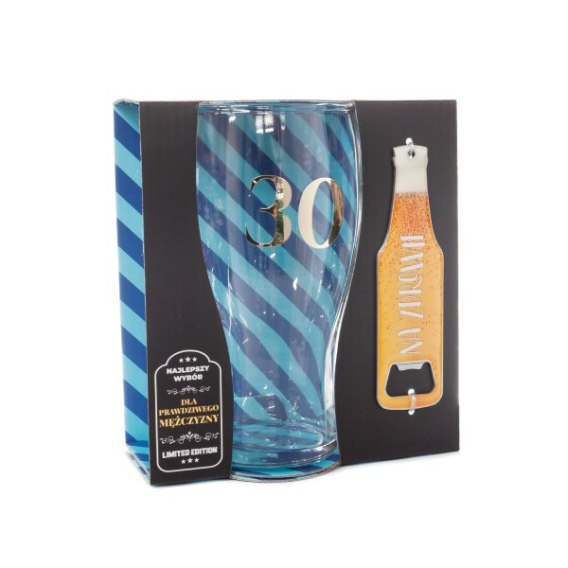 Zestaw 2w1 szklanka do piwa ze złotą cyfrą "30" z otwieraczem do butelek "Na zdrowie " w ozdobnym opakowaniu prezentowym . 500 m